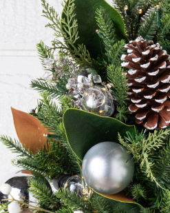 - mit Kiefern- und Zedernlaub mit Tannenzapfen, Beeren und einer roten Schleife