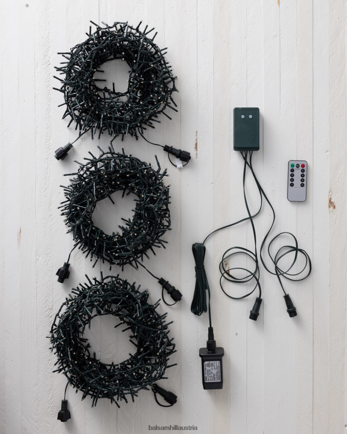 - enthält 3 dunkelgrüne Lichterketten, 1 Fernbedienung und 1 Transformator
