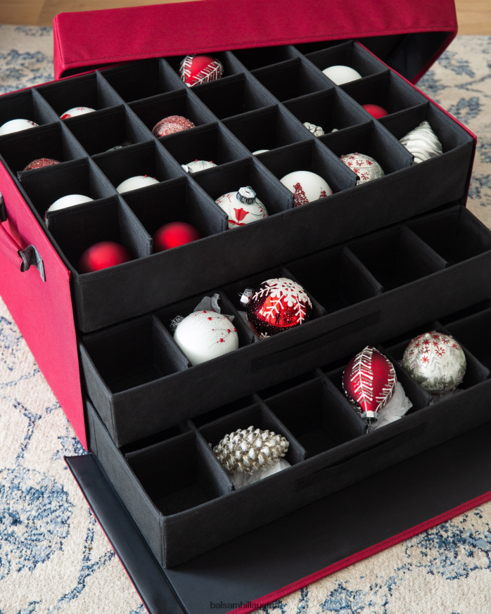 Mit unserer exklusiven Aufbewahrungsbox können Sie Ihren Schmuck für die kommenden Feiertage ordentlich verstauen. Dieser Organizer ist für eine einfache Verwendung konzipiert und verfügt über drei herausnehmbare Tabletts mit Trennwänden, die Ihre empfindlichen Baumaccessoires schützen. Sparen Sie Platz und Zeit mit unserer stapelbaren Aufbewahrungsbox für Weihnachtsschmuck, die zur problemlosen Identifizierung in tiefem Rot erhältlich ist.