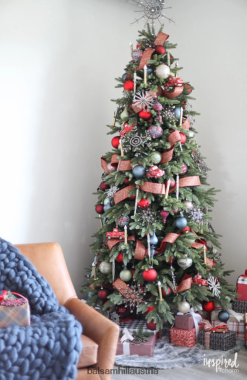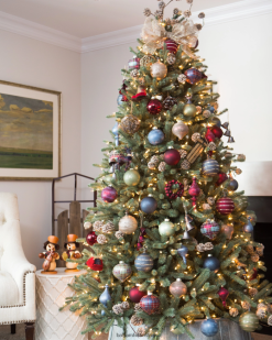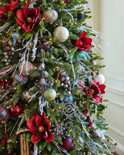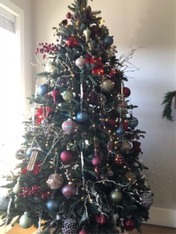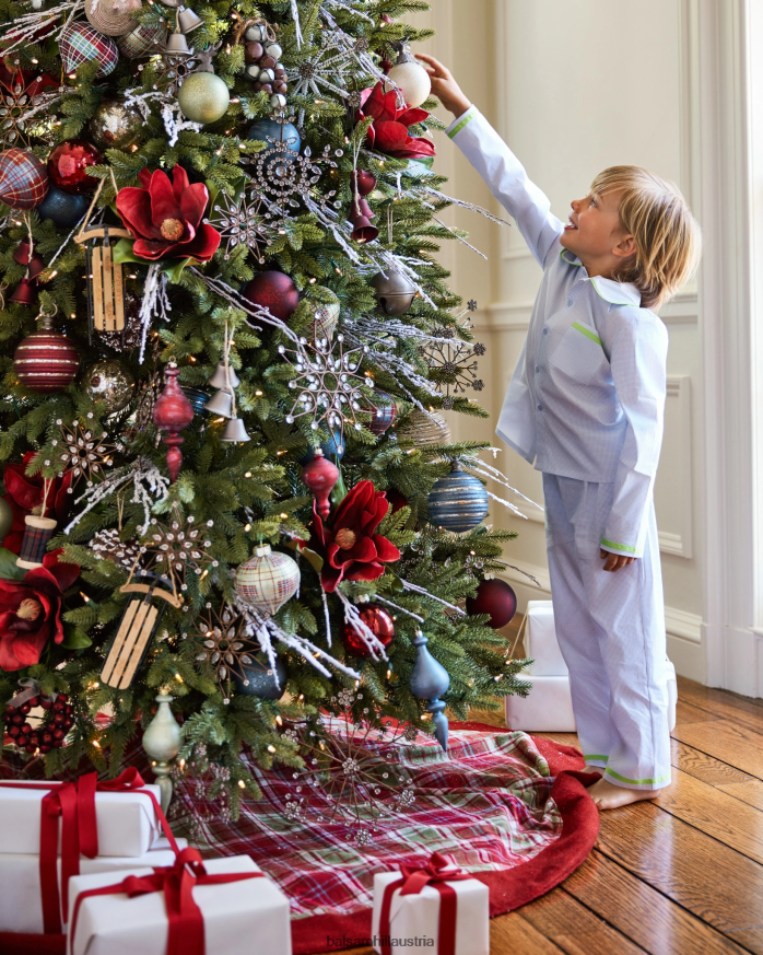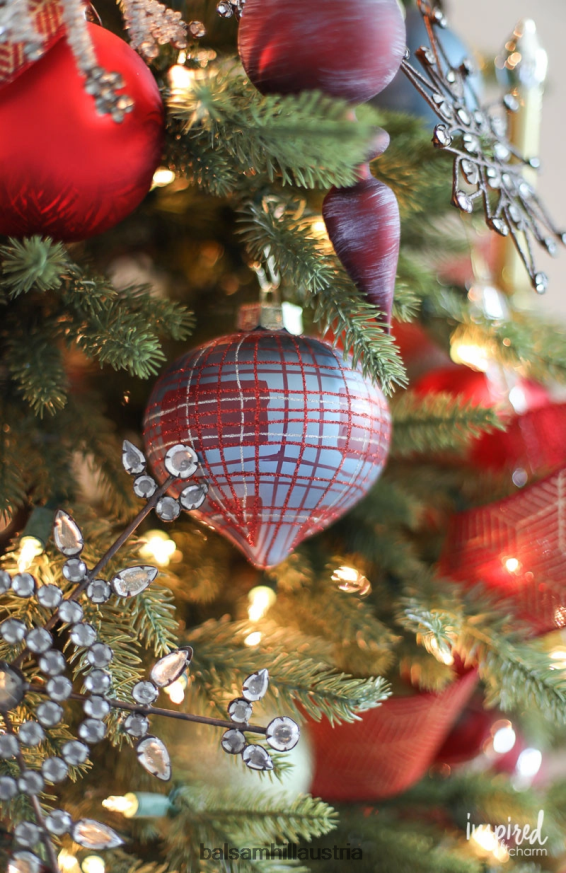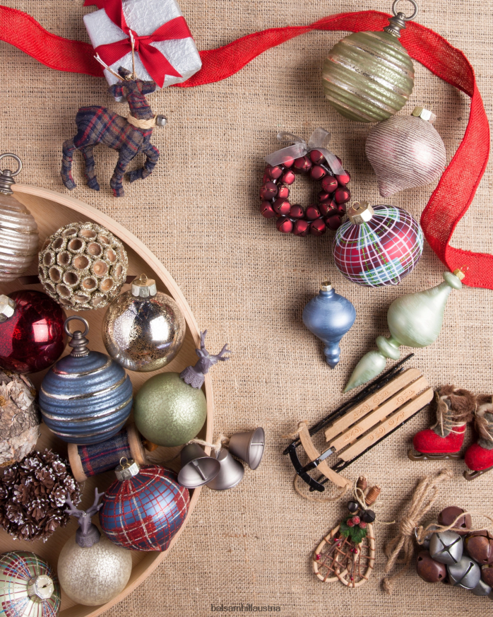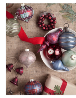 - verfügen über mundgeblasene Glasornamente in Rot-, Blau- und Grüntönen mit Glitzer-Finish und Karomustern