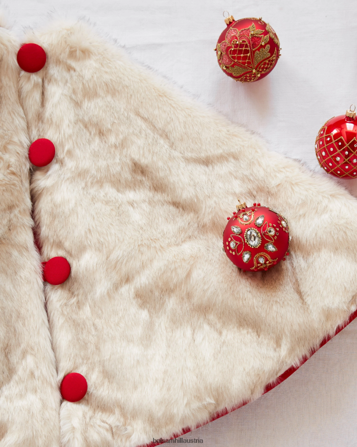 Unser flauschiger Weihnachtsbaumrock ist schlicht und doch elegant und verleiht Ihrer Weihnachtsdekoration einen Hauch von Farbe. Der rote Besatz und die passenden Knöpfe heben sich von der weichen elfenbeinfarbenen Basis ab und machen ihn zu einem festlichen Akzent für Geschenke unter dem Weihnachtsbaum.