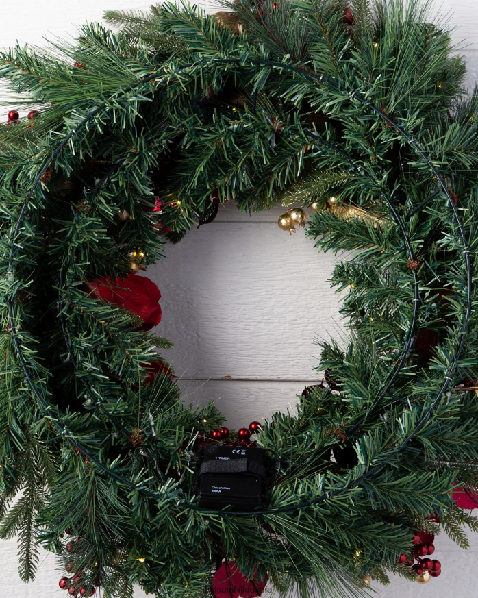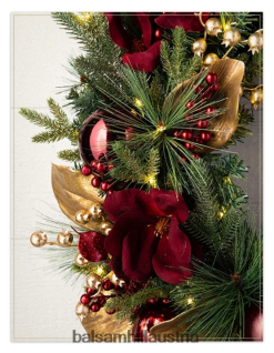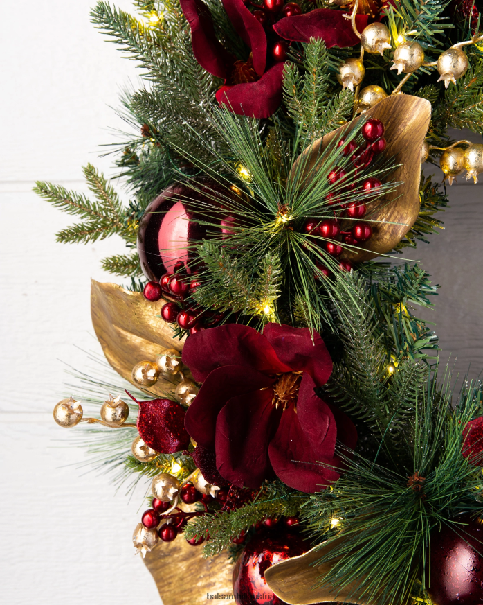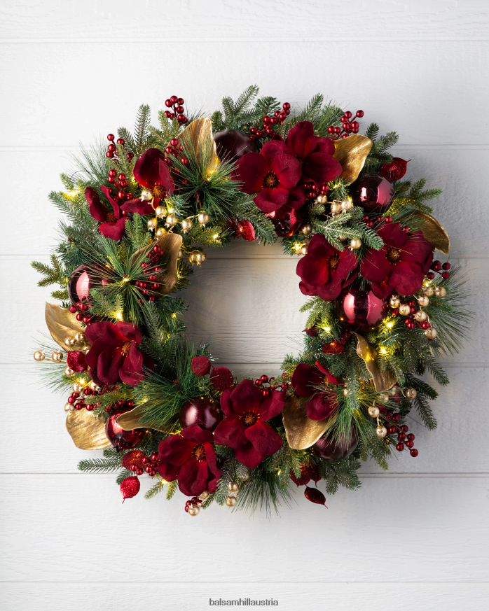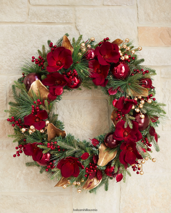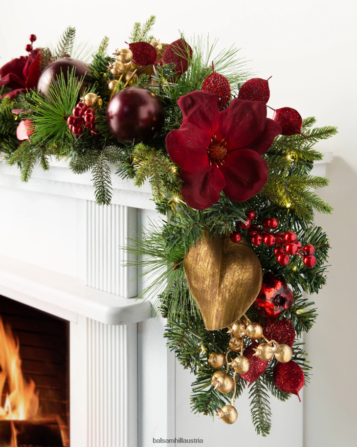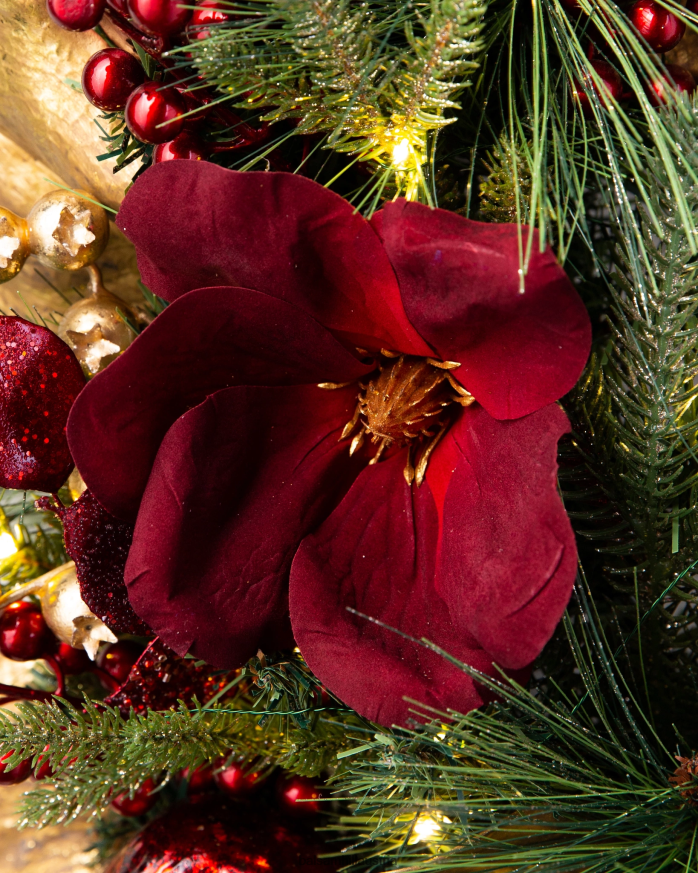 - Alle Produkte dieser Kollektion zeichnen sich durch glitzerndes Kiefernlaub mit samtroten Akzenten aus Magnolien, goldene Magnolienblätter, rote und goldene Beeren, Granatäpfel und rote, bruchsichere Ornamente