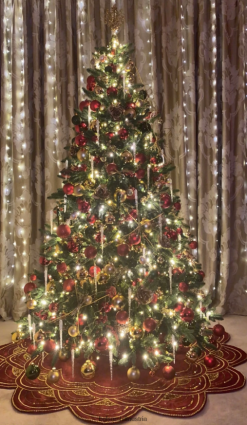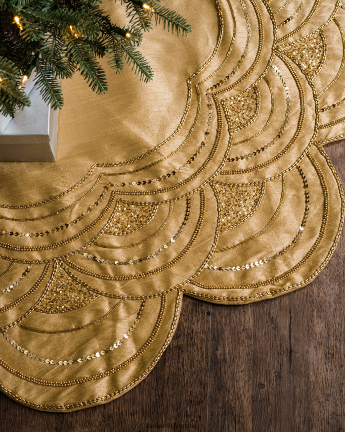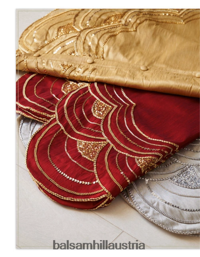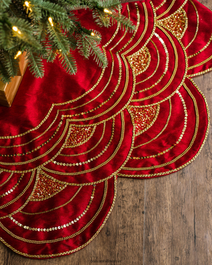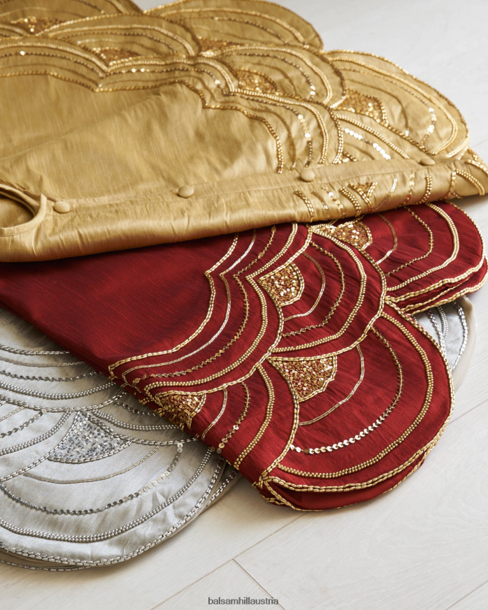 Schmücken Sie Ihren Weihnachtsbaum mit unserer Auswahl an perlenbesetzten Baumröcken in luxuriösen Farbtönen. Dieser exklusive Baumrock verfügt über ein Dupionimitat-Gewebe für einen leuchtenden Seideneffekt und Wattierung für zusätzliche Dicke. Die gewellten Kanten sind zusätzlich mit handapplizierten Perlen und Pailletten verziert, während mit Stoff überzogene Knopfverschlüsse für zusätzlichen Komfort sorgen.