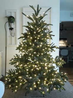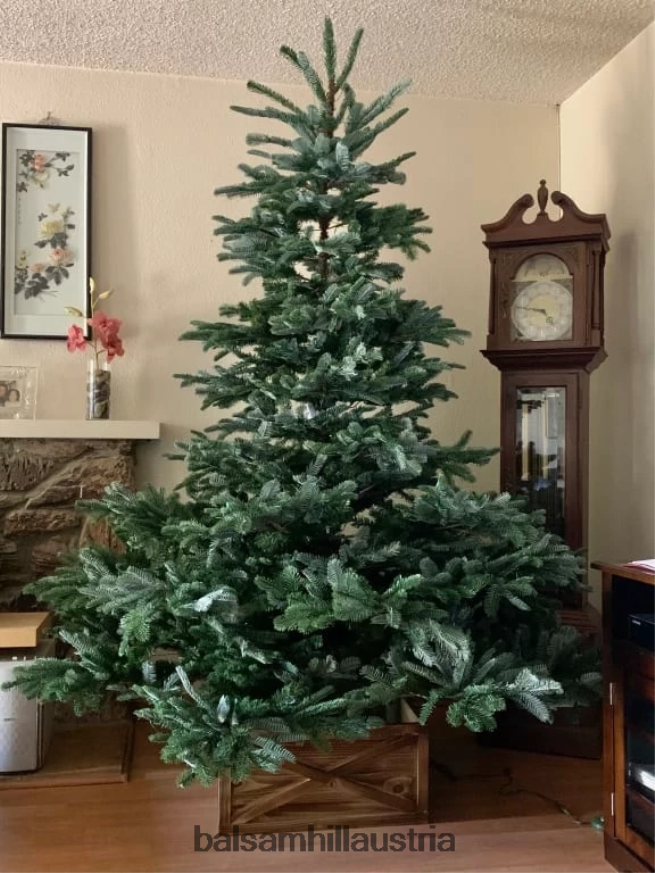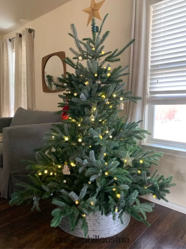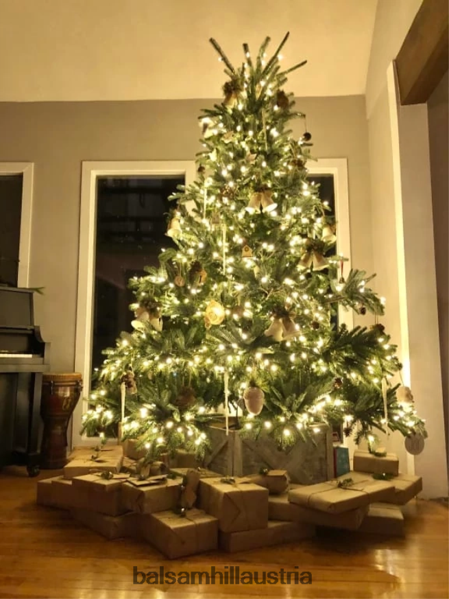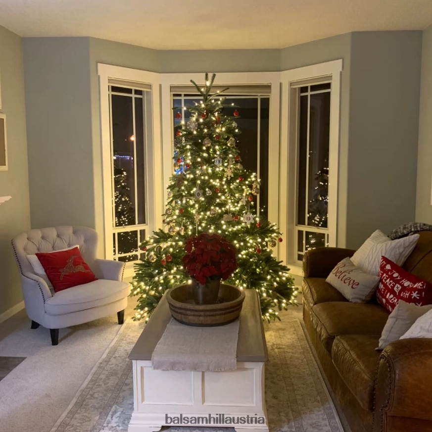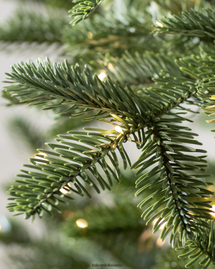 Dunkelgrüne Nadeln und ein volles, birnenförmiges Profil sorgen für eine wunderschöne Darstellung, während lange Äste an der Spitze des Baumes nach oben reichen, um ein natürlicheres Aussehen zu erzielen.