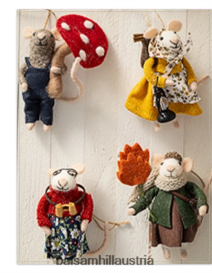 - mit Filzmäusen mit einem Pilz, einem Tannenzapfen, einer Gaslampe, Blättern und einem Fernglas
