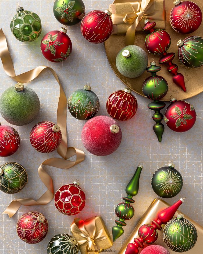 - verfügen über runde Ornamente und Endstücke mit Zuckerguss-Finish und Handarbeit -bemalter Glitzer