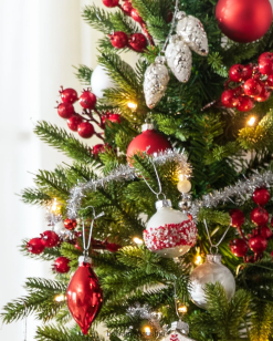 - Nordic Frost verfügt über eine Girlande aus silbernem Lametta mit Akzenten aus weißen, silbernen und roten Kunststoffperlen