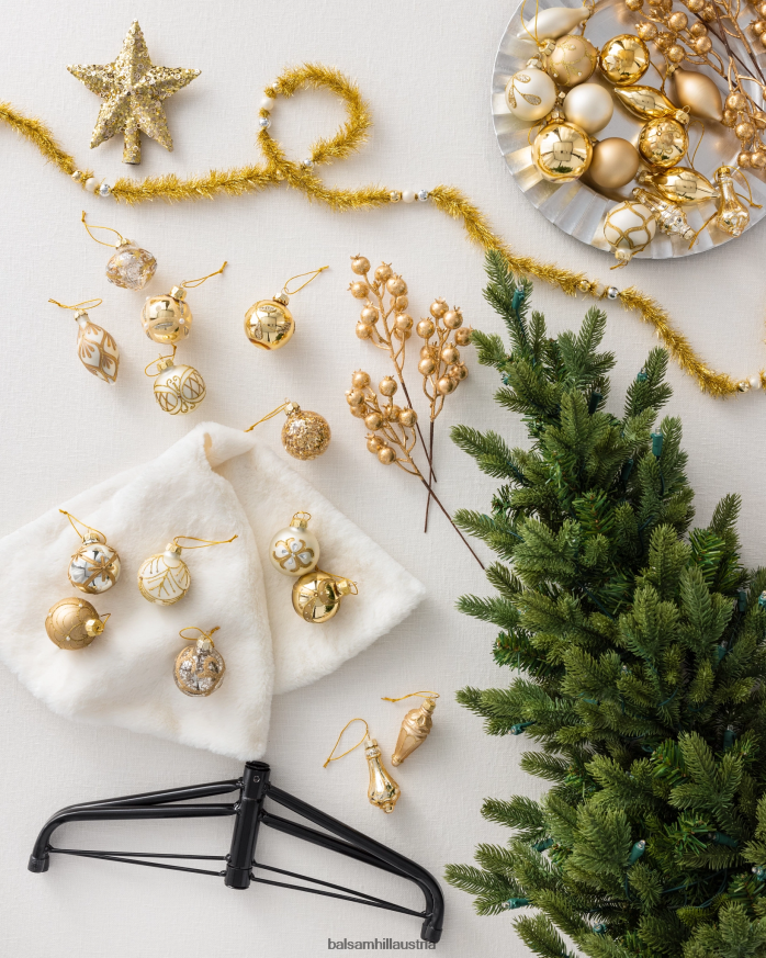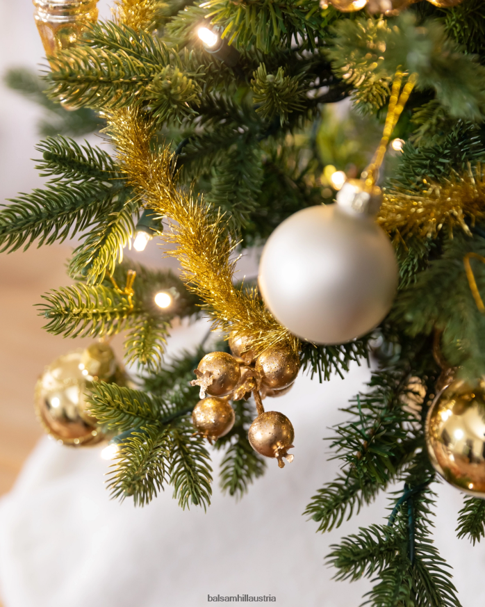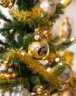 - Vergoldeter Glanz mit einer Girlande aus goldenem Tinsel akzentuiert mit weißen, silbernen und goldenen Kunststoffperlen