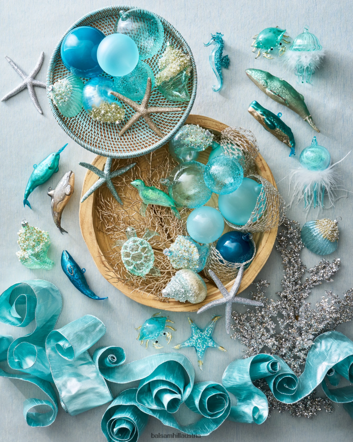 Machen Sie Akzente mit Wasserakzenten, die Ihrer Weihnachtsdekoration einen Hauch von Charme verleihen. Muscheln, Seesterne und andere Meereslebewesen sorgen für Badespaß beim Dekorieren.