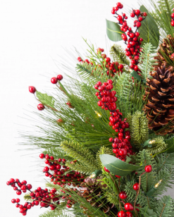 Schaffen Sie mit zeitlosen Weihnachtsfarben eine Atmosphäre ländlicher Gemütlichkeit. Lebendige immergrüne Pflanzen mit leuchtend roten Beeren und natürlichen Tannenzapfen begrüßen die Feiertage mit einem Hauch von rustikalem Charme.