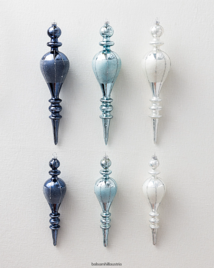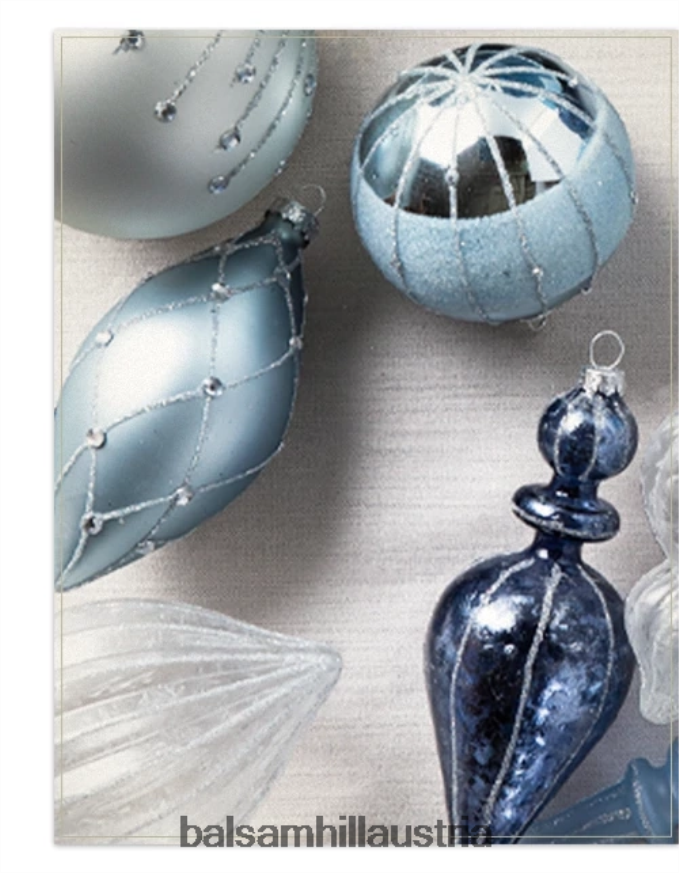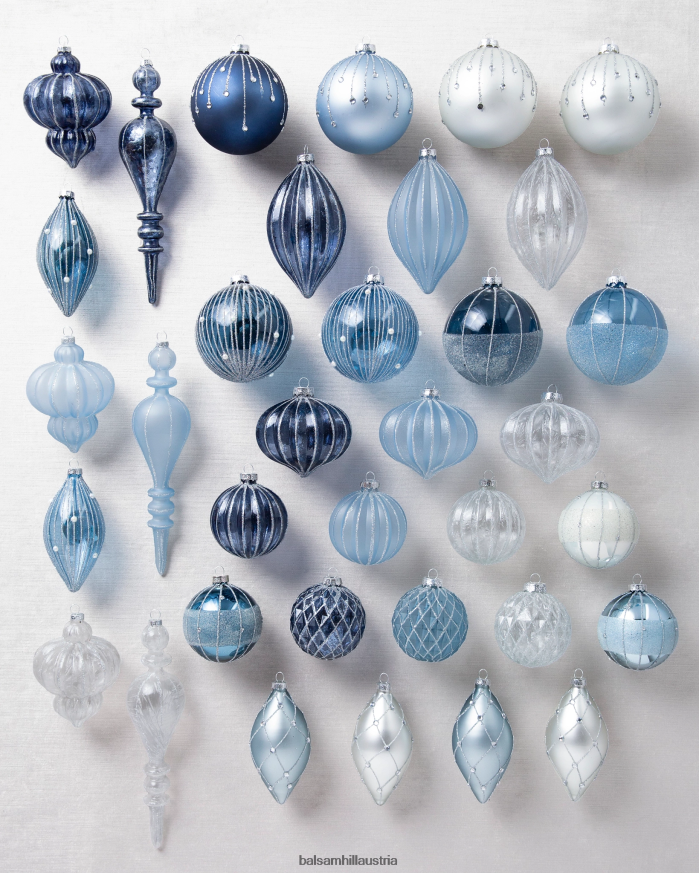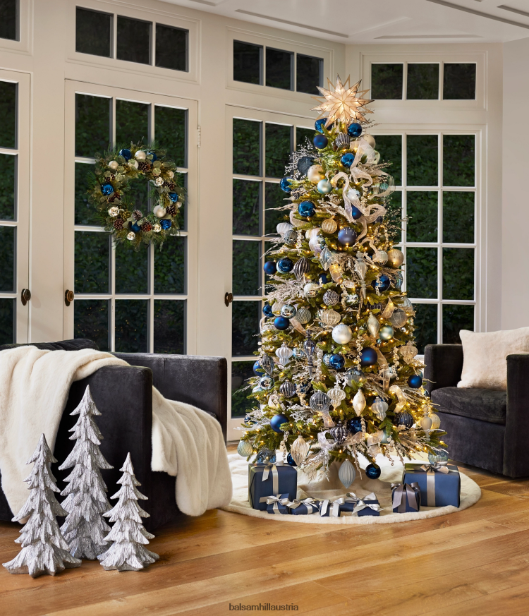 fangen Sie das Wunder mondheller Winternächte ein. Dekorieren Sie Ihr Feiertagslaub mit dieser Kollektion tiefblauer und silberner Ornamente, um die Magie eines Sternenhimmels nachzubilden.