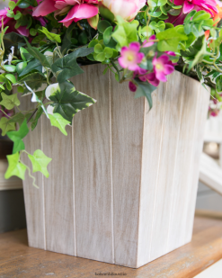 - eingestellt in einem Holzgefäß mit grauer Waschung und den Maßen 11” lang x 11” breit x 11,75” hoch