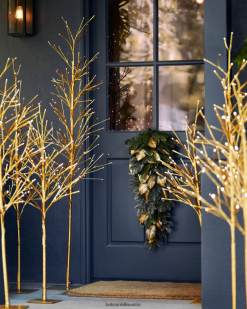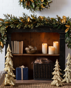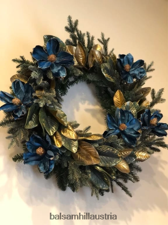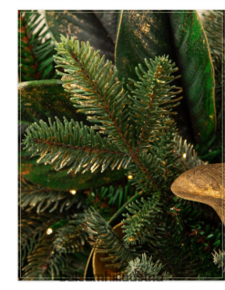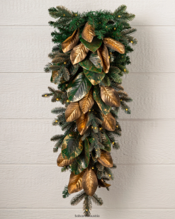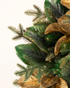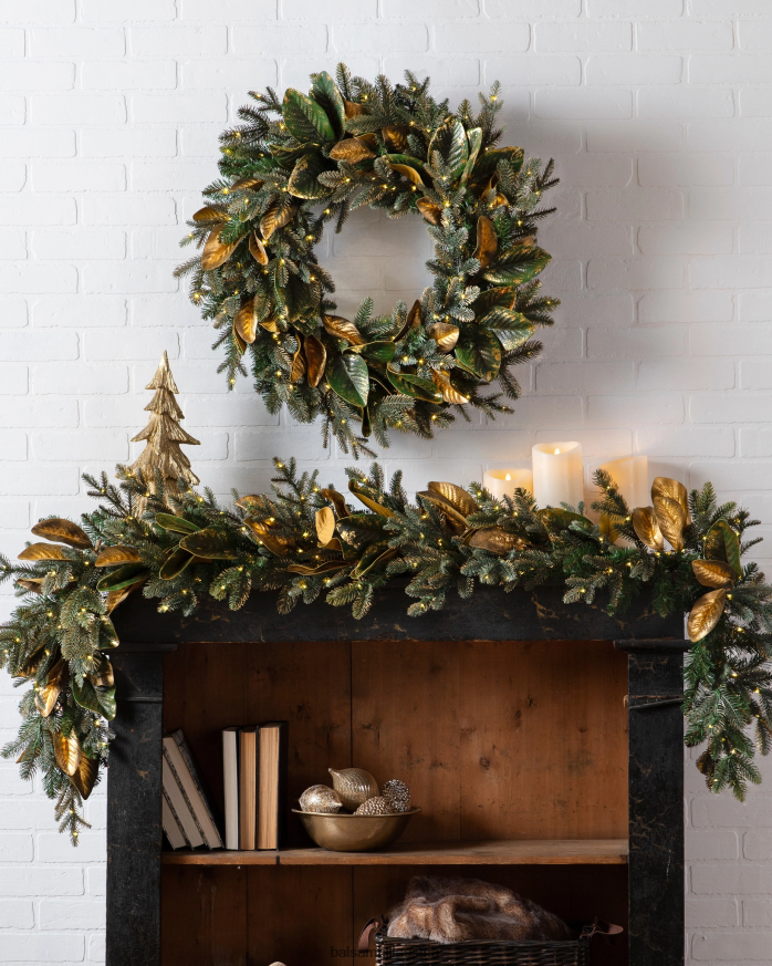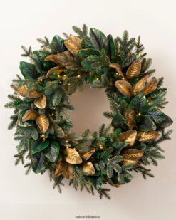 Bringen Sie einen Hauch von Waldeleganz in Ihre Wohnräume. Goldene Magnolienblätter und bezaubernde Lichterketten schaffen eine bezaubernde Urlaubsszene.