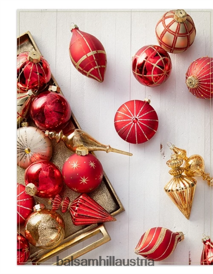 Verbessern Sie das Aussehen Ihrer Urlaubsbegrünung mit einem Hauch von Rot und Gold. Diese zeitlosen Ornamente verleihen Ihren Lieblingsdekorationsthemen mehrschichtige Struktur und Glanz.