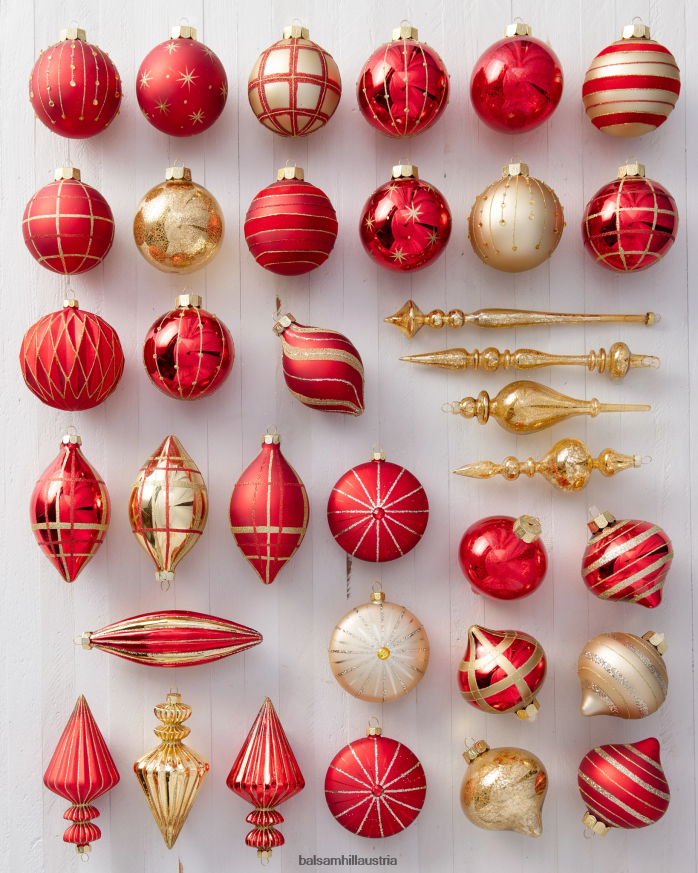 - enthält eine Auswahl an Bällen , Tropfen, Zwiebeln und Endstücke in verschiedenen Rot- und Golddesigns und -ausführungen